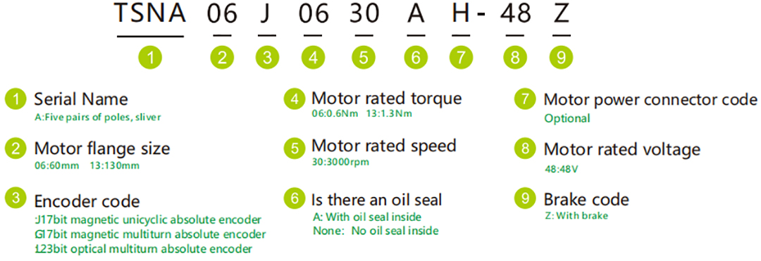 TSN series low-voltage servo motors cover the power range of 0.05~1.5kW, and are equipped with communication encoders for higher positioning accuracy. This series motors have a rated speed of 3000rpm, and have torque-frequency characteristics of the same specifications as AC servos, which can meet the needs of high-performance low-voltage servo applications.
